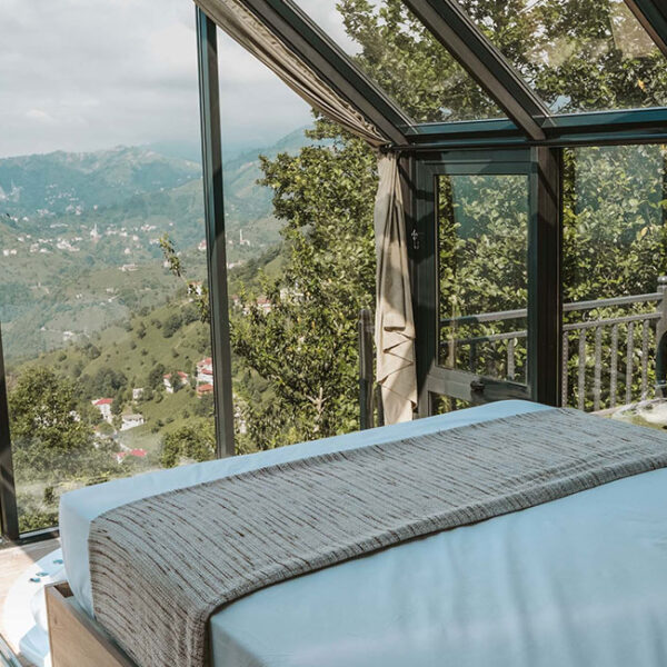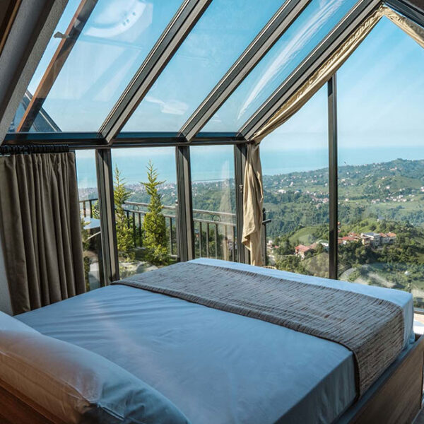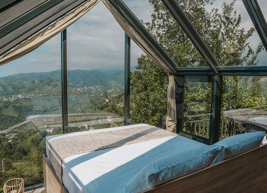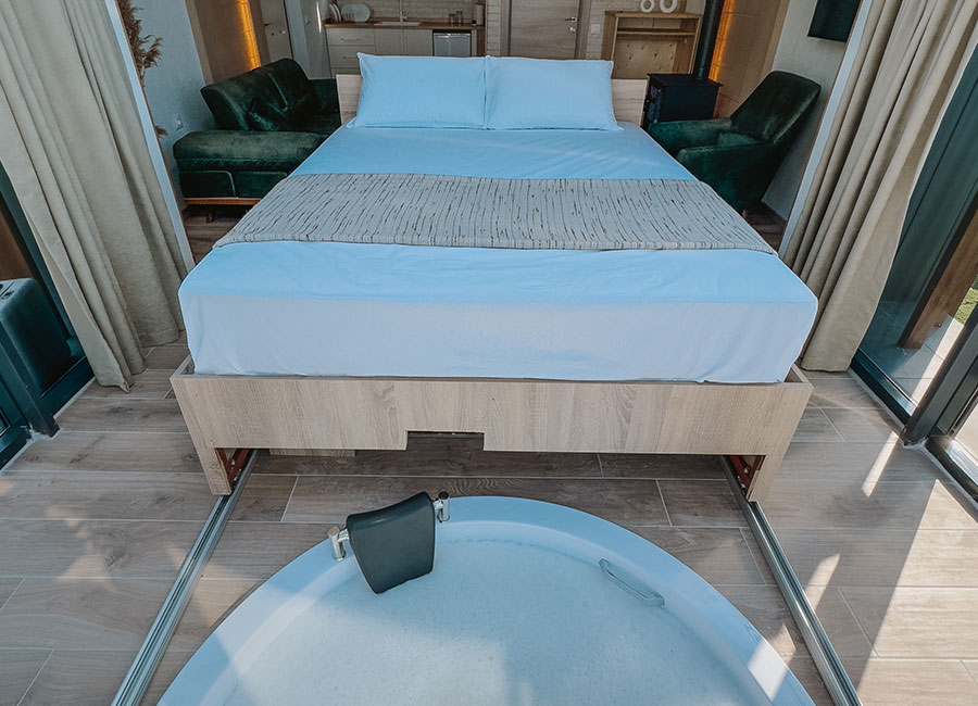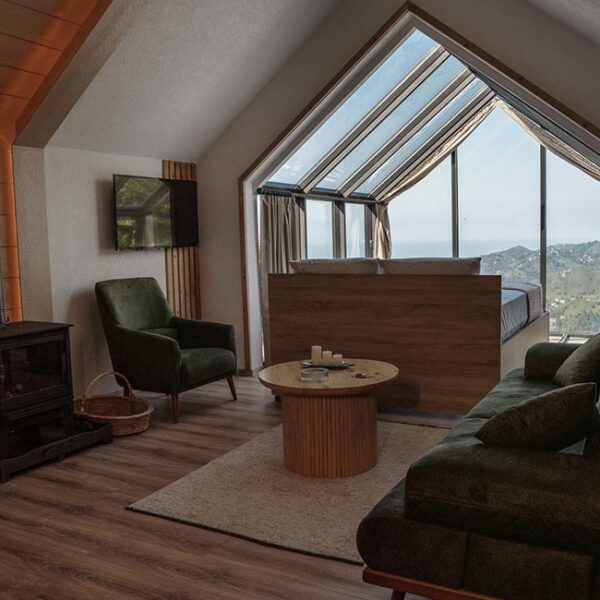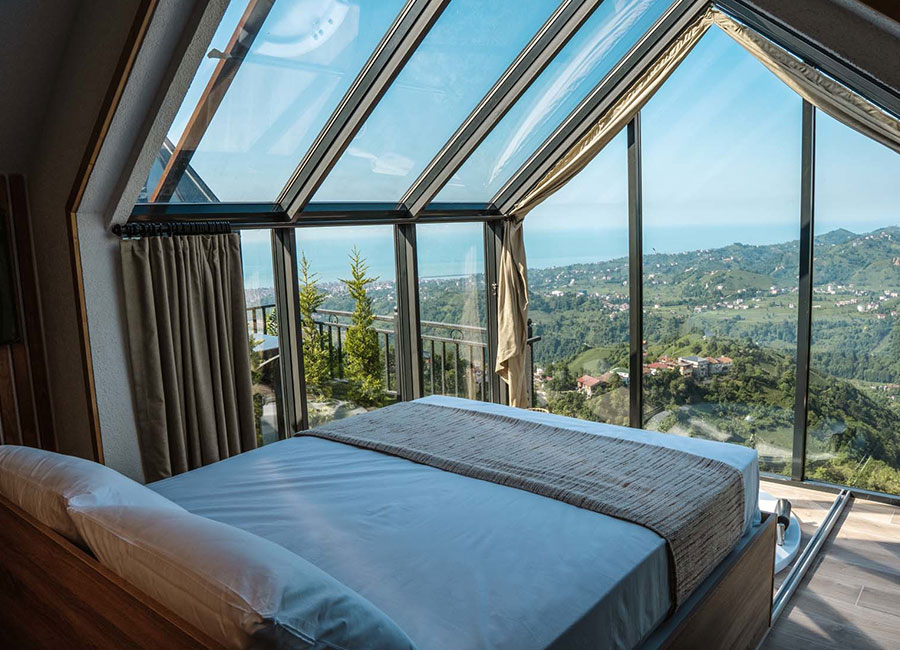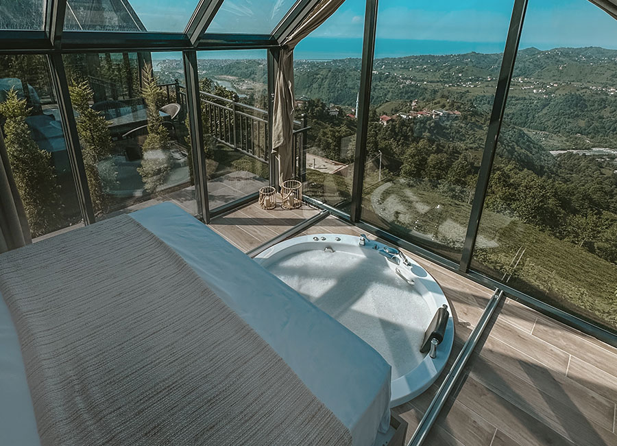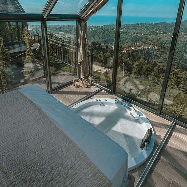 301 numaralı odamız, 45 metrekare genişliğinde olup, jakuziye açılan sürgülü yatağı ve cam tavanıyla eşsiz bir konfor sunmaktadır. Odamızda klima, su ısıtıcı, şömine, jakuzi, bir çift kişilik yatak, bir koltuk ve berjer, banyo, mutfak ve teras bulunmaktadır. Perdeler ve örtüler ile pamuk nevresim takımları, bölgenin doğal ruhunu yansıtan ahşap detaylarla estetik, kaliteli ve kullanışlı bir şekilde tasarlanmıştır. Kaçkar Dağları, Fırtına Vadisi ve Karadeniz manzarasını gözler önüne seren bu oda, deniz manzarası eşliğinde huzur dolu bir deneyim için sizi bekliyor.